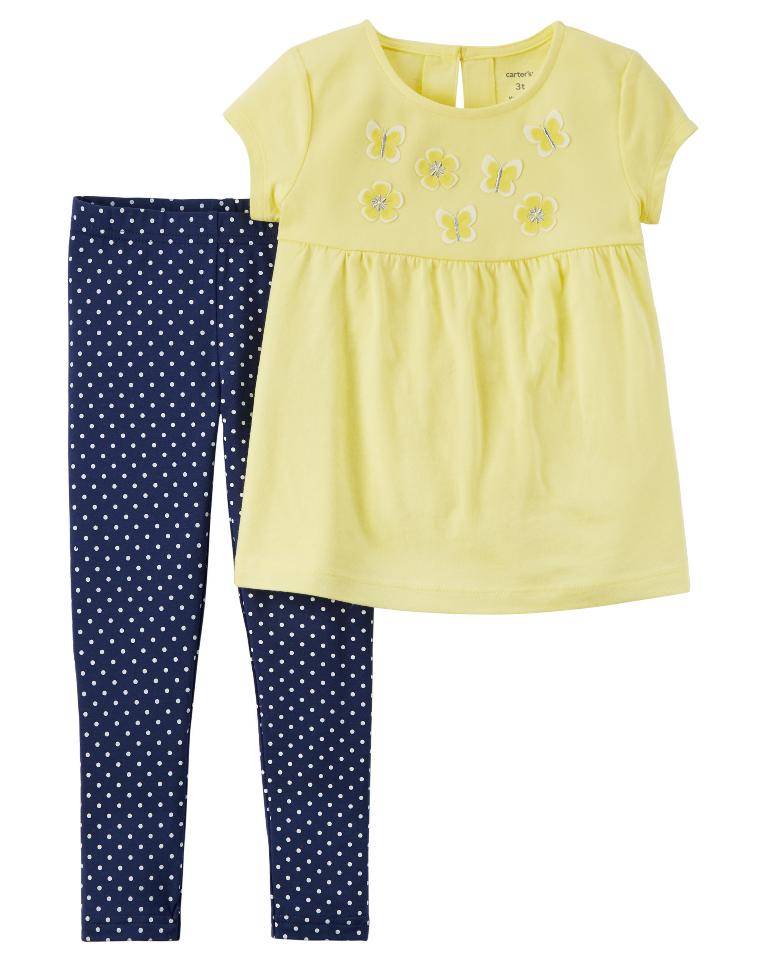 Оригинал Carter's 2 Pack Yellow Flower Applique Babydoll Top with Navy Polka Dot Printed Leggings Set - Toddler