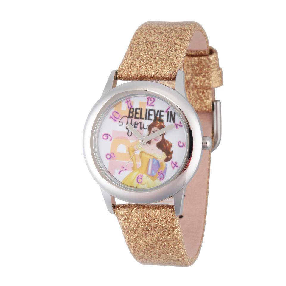 Оригинал Disney Girl's Belle Stainless Steel Watch - Gold Glitter Leather Strap